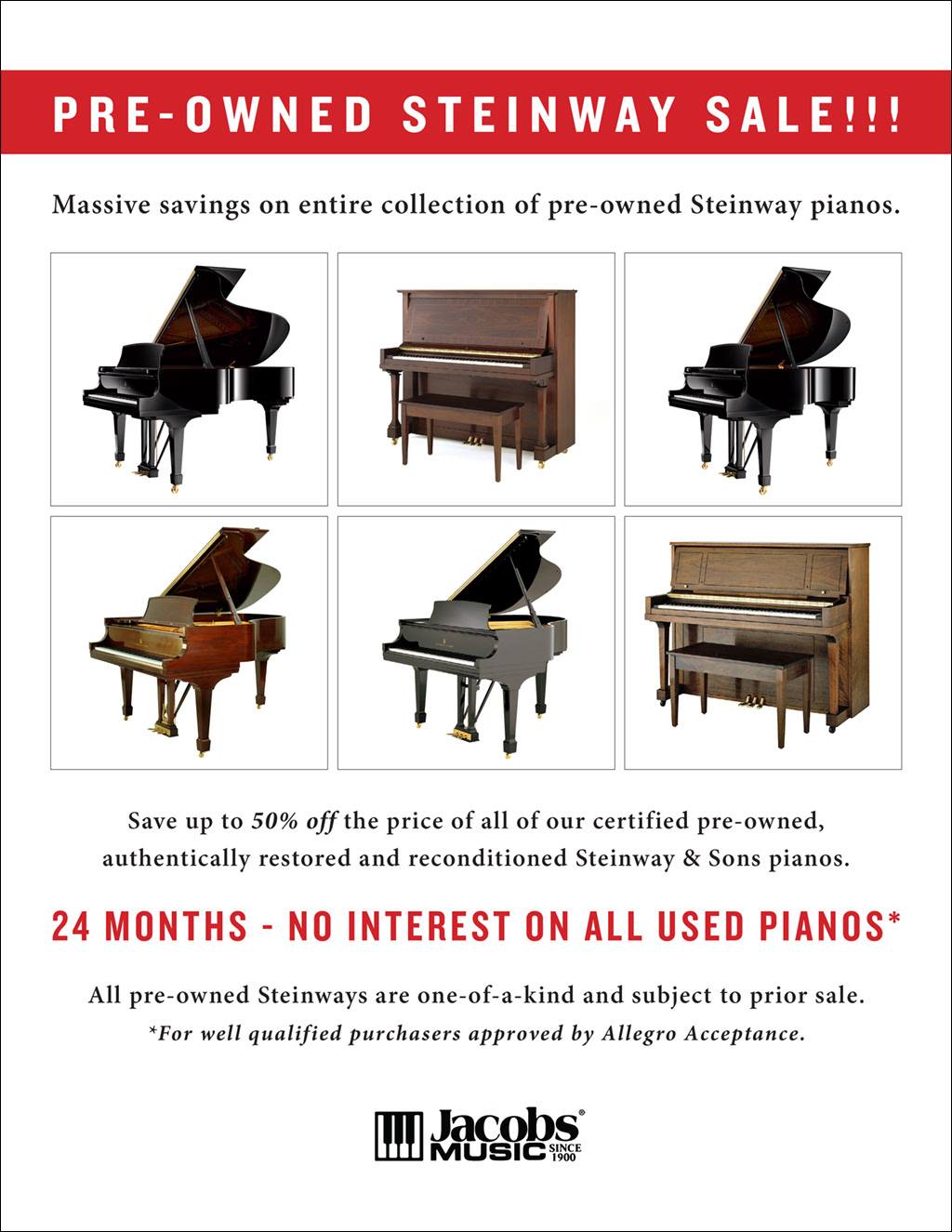 "Pre-Owned Piano Sale" flyer ad campaign highlights the quality & craftsmanship of Steinway & Sons handmade, restored & reconditioned pianos. - #eventpromodesign #flyerdesign #saleflyerdesign #anniversarysaleseventdesign #brandmarketigndesign